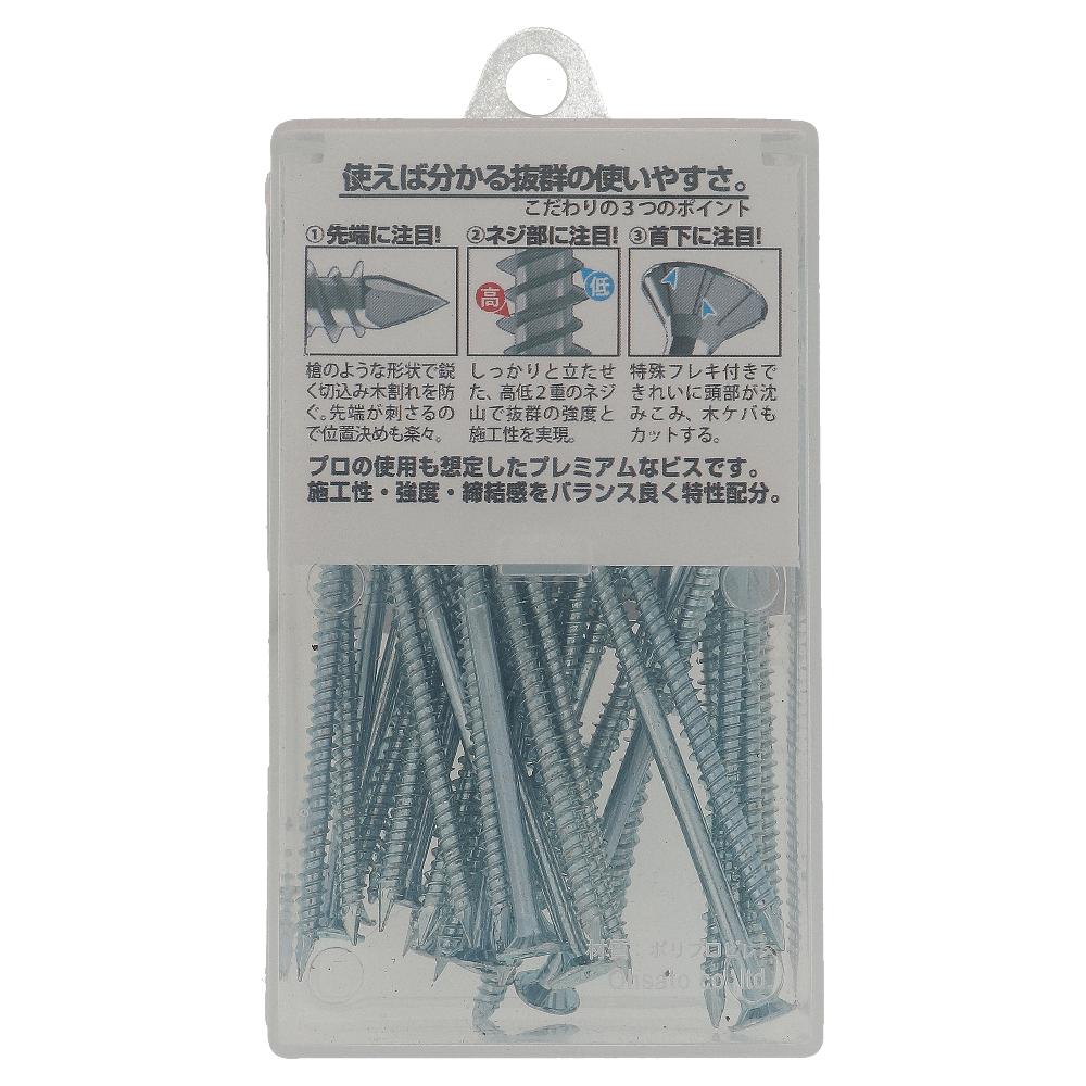 先端に特殊刃先がついていて、木が割れにくいのに引き抜き強度抜群!位置決め打ちこみも楽々。ネジ部は、高低山の2条ネジで電動工具のバッテリーもちも良好!