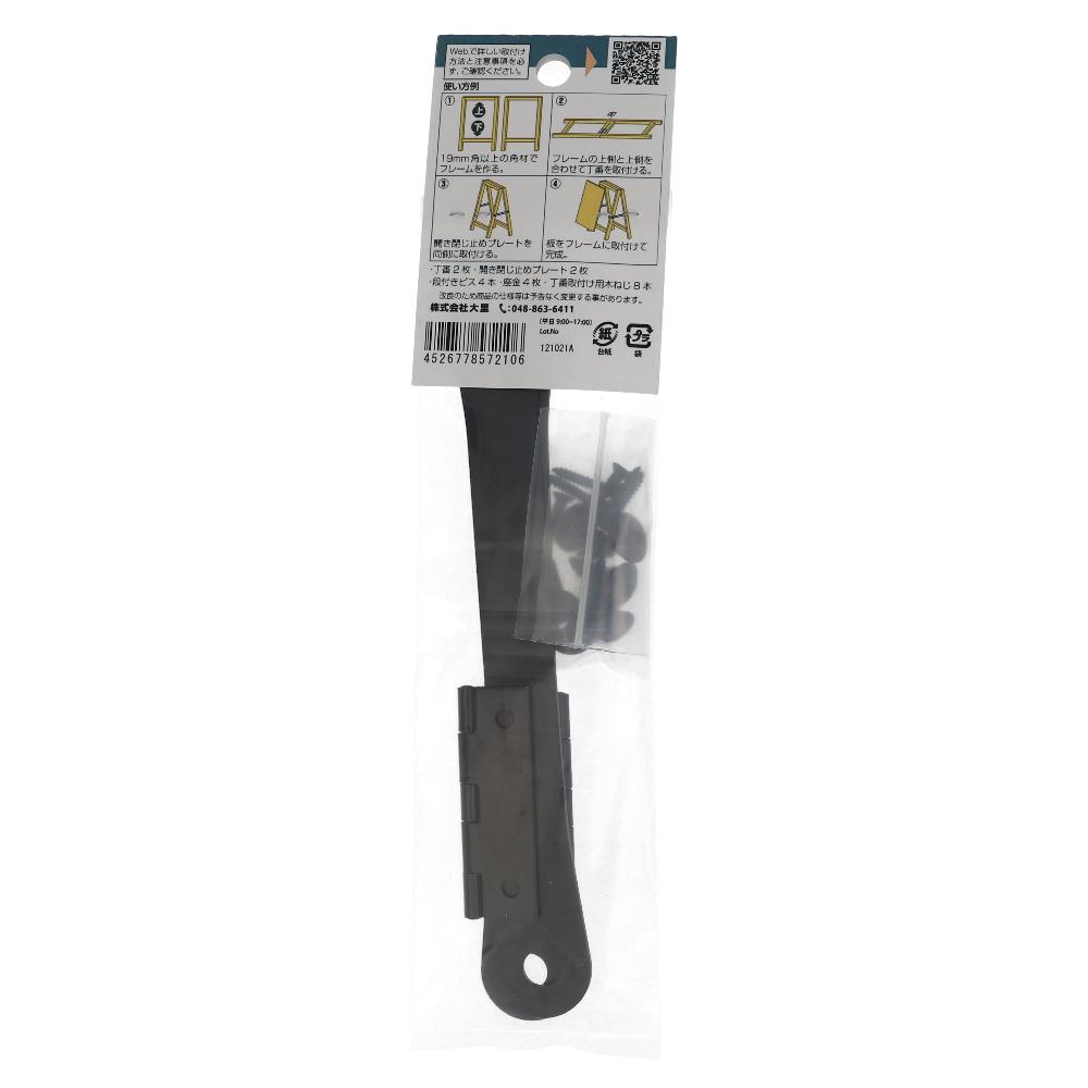A型看板をつくる際に便利な開き閉じ止めプレートとプレート固定用ビス・座金、蝶番と蝶番固定用ビスがセットになっています。