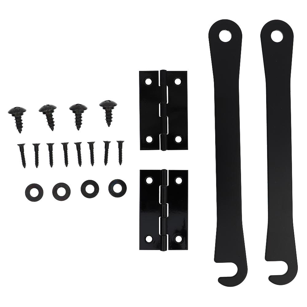 色:ブラック  セット内容:開き閉じ止めプレート(2枚)/段付きビス(4本)/座金(4個)/蝶番(2枚)/蝶番取付用ビス(8本)  材質:鉄  処理:カチオン黒